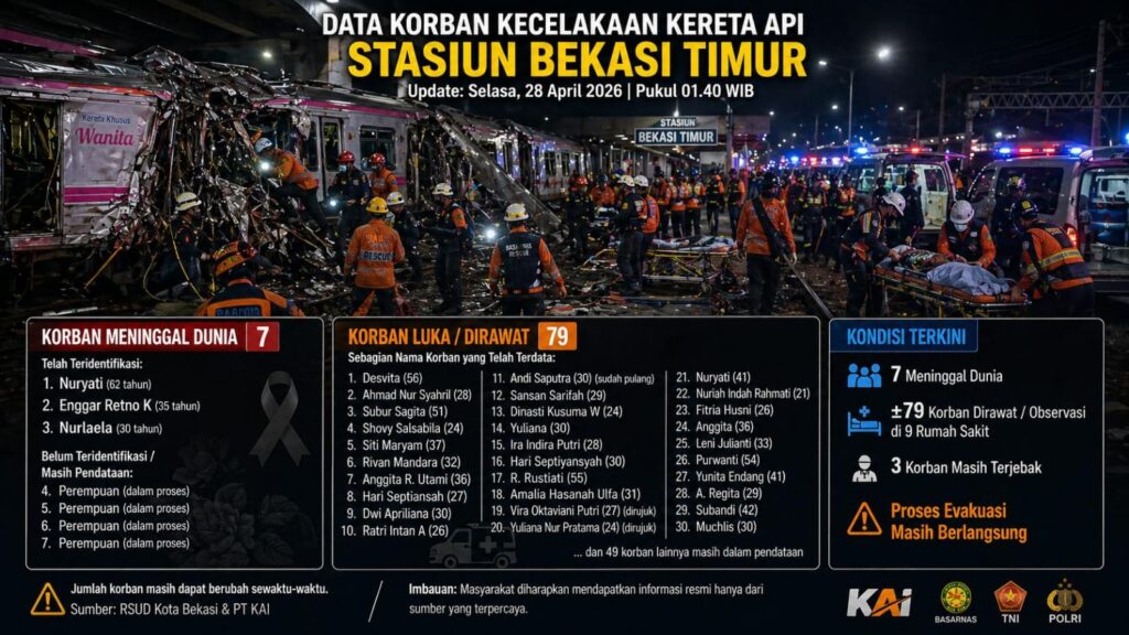 Kota Bekasi — BEKASIKEPO.COM – Kecelakaan maut antara KA Argo Bromo Anggrek dan KRL di Stasiun Bekasi Timur, Selasa dini hari (28/04/2026), menelan korban jiwa. Hingga update terbaru, 7 orang dinyatakan meninggal dunia, sementara 3 korban lainnya masih terjebak di dalam gerbong.